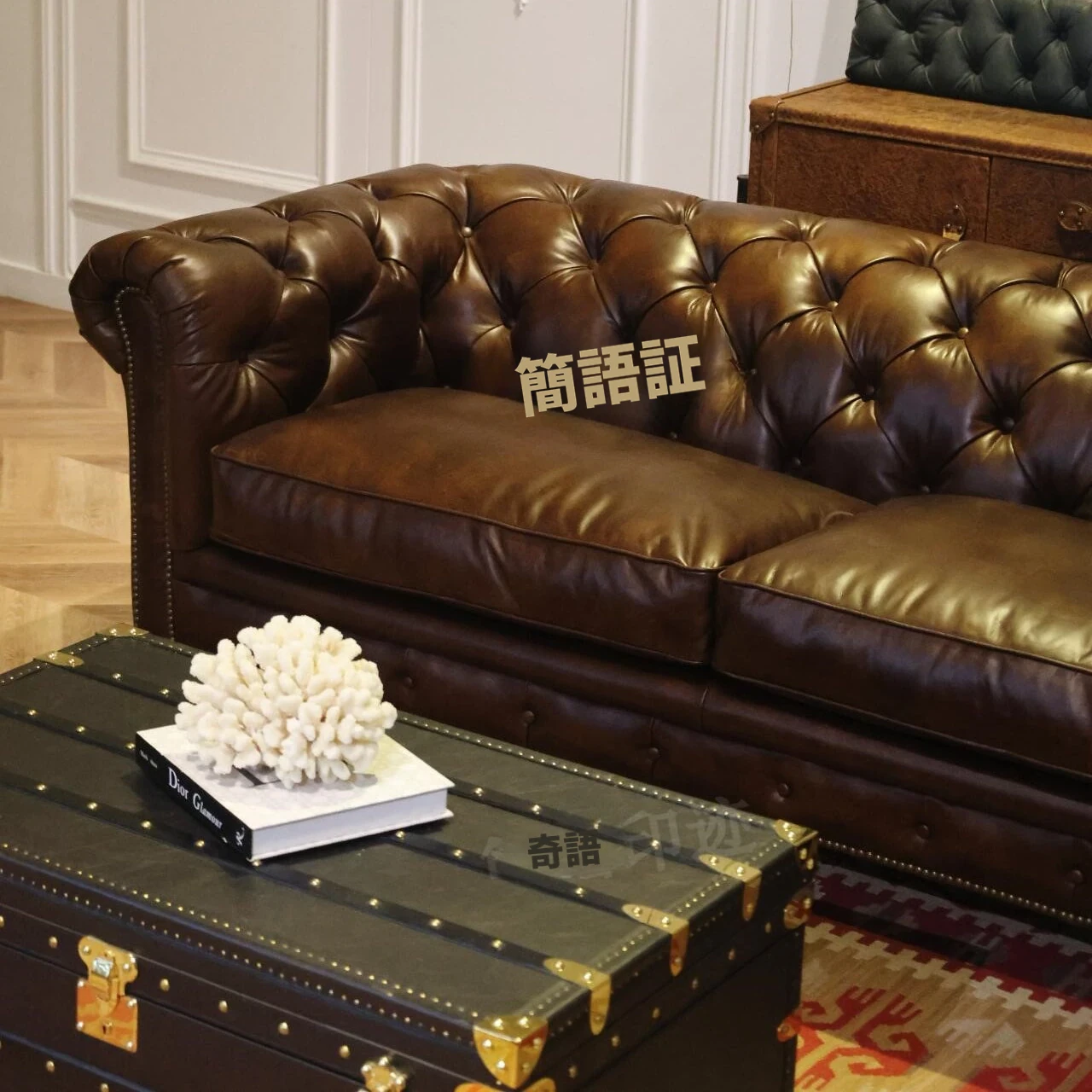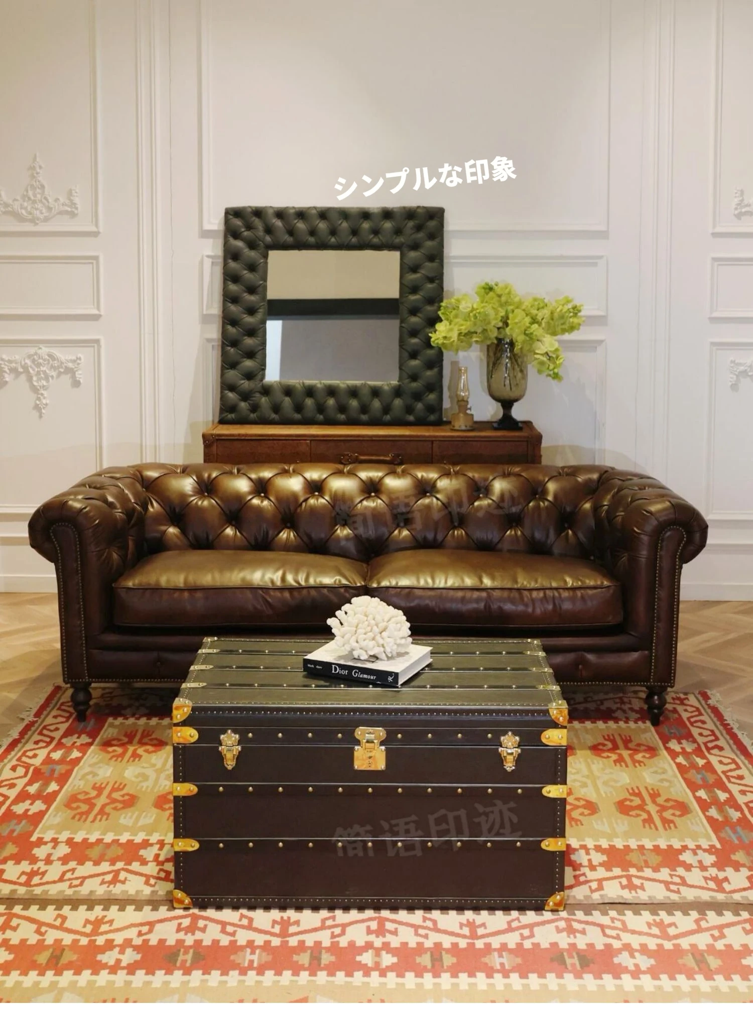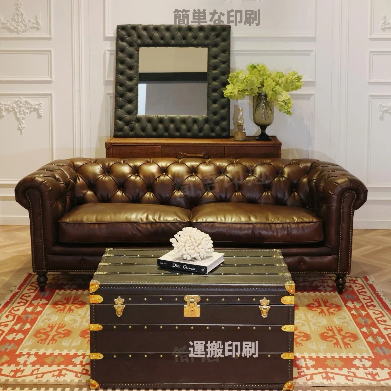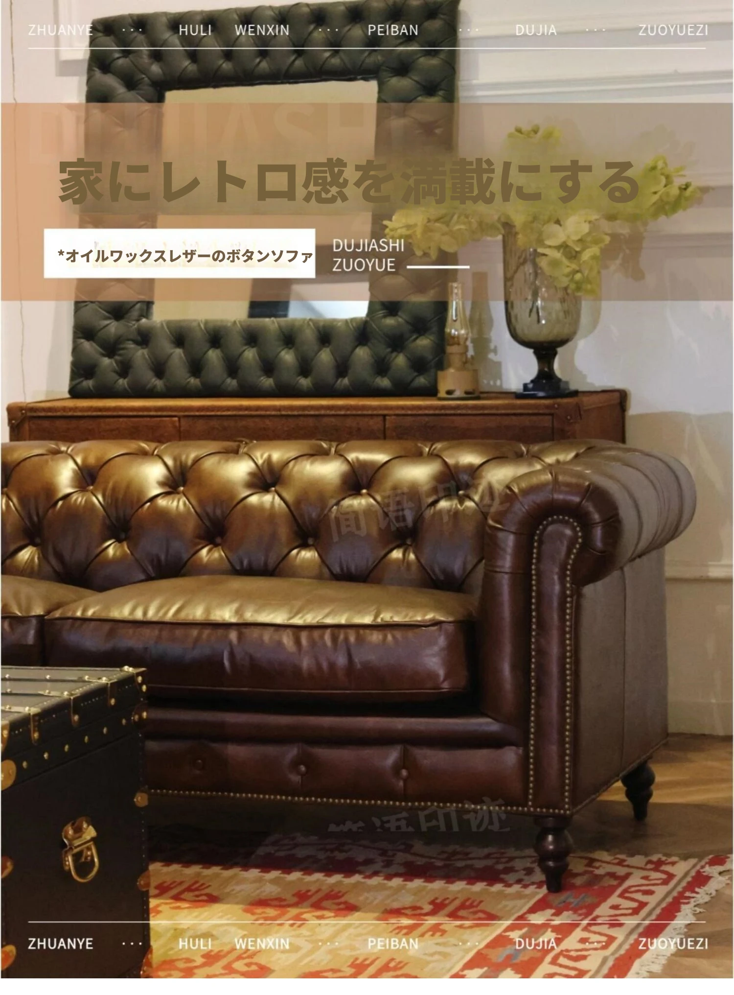 ヴィンテージ風ソファ アメリカンラグジュアリー本革ソファ リビングルームに最適なクラシックレトロオイルワックスレザー シガーバー付きラッチソファ