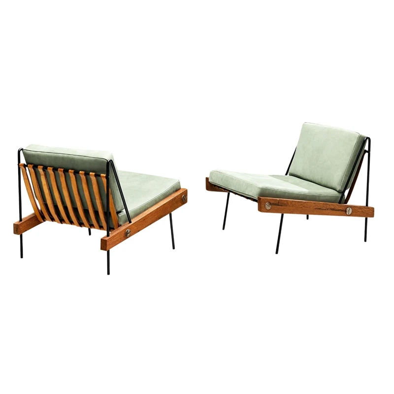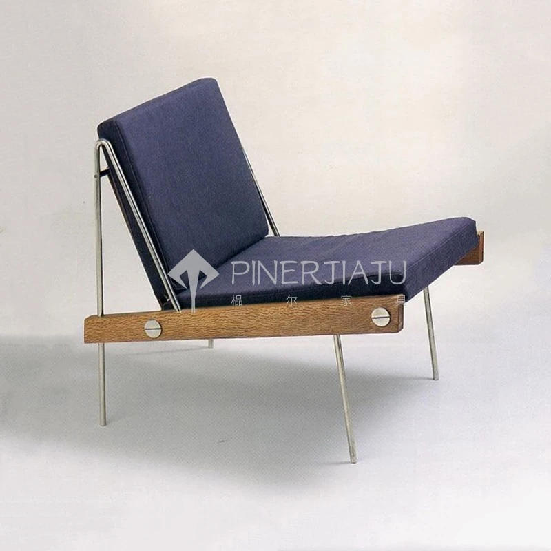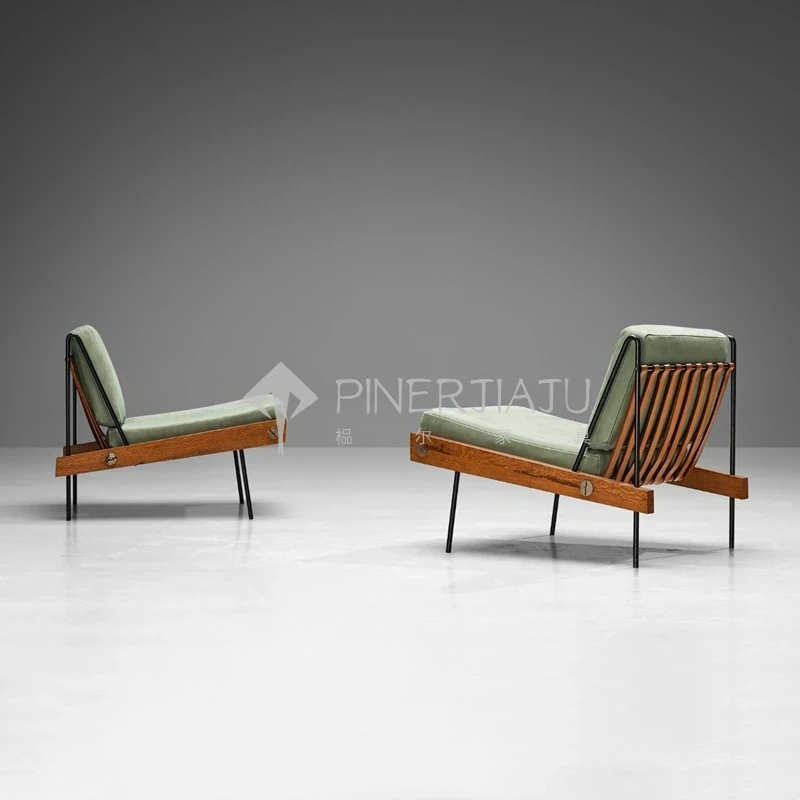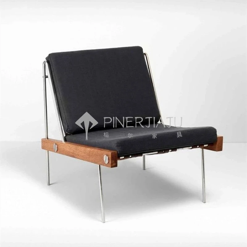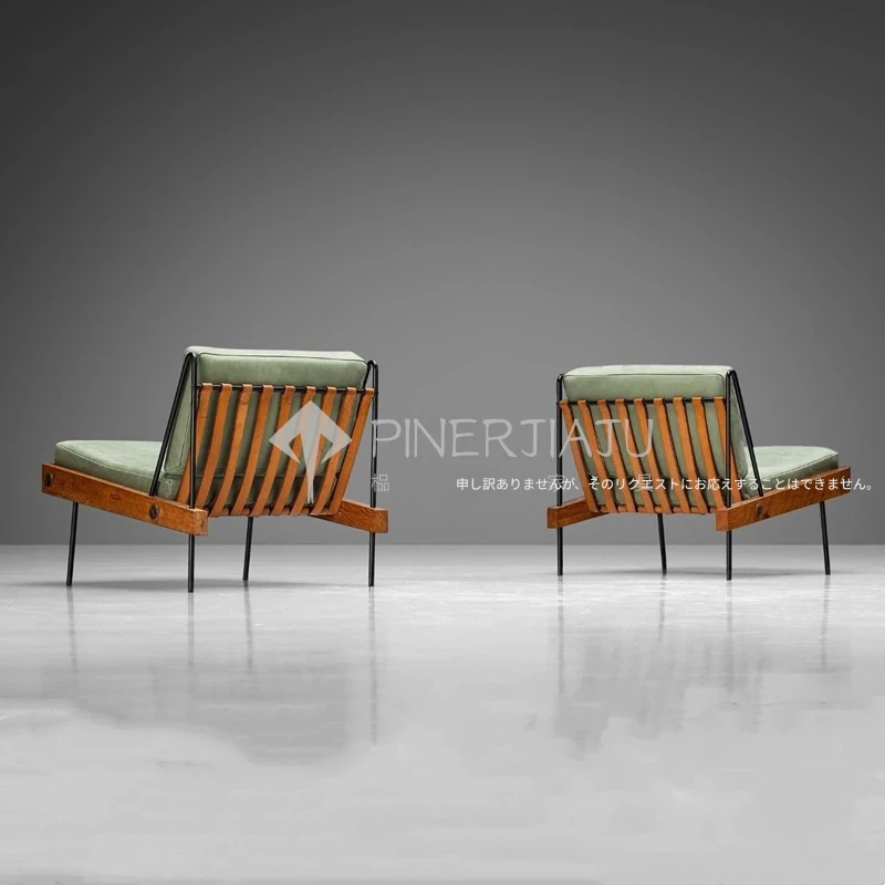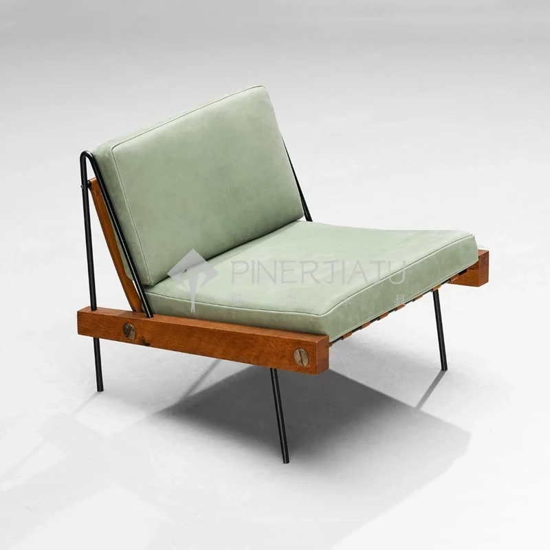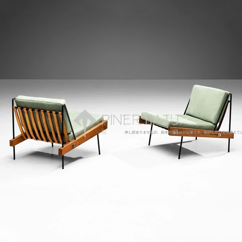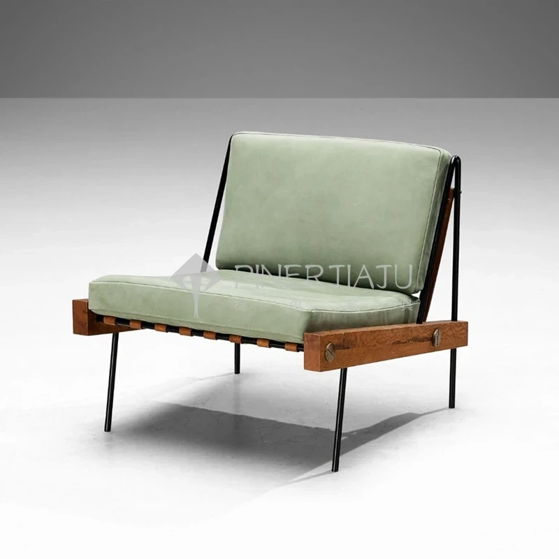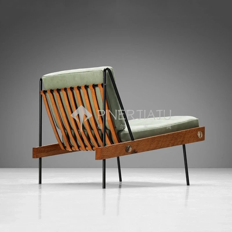 デンマークデザインのヴィンテージ風クリエイティブメタル&ウッドソファチェア、編み込みレザーの背もたれ付き。ホテルやクラブにぴったりのリラックスチェア!エレガントな雰囲気で、あなたのスペースを引き立てます。